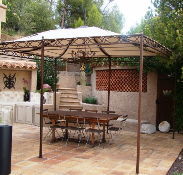 Pavillon en fer forgé, c'est une structure en fer avec toit en forme sur lequel repose un dôme, sur-mesure, la frise déco permet un maintien entre chaque poteau de plus de 4m, N'hésitez pas à nous demander votre sur-mesure.