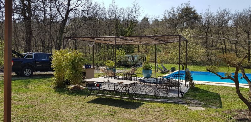 Tonnelle "Guinguette" en fer 6m x 4m, hauteur 2,50 m, avec une structure en tube 50x50, et fer en té traditionnel (toiture) et 6 poteaux, alliant robustesse et charme rétro pour recréer l'ambiance conviviale et festive des guinguettes d'antan. N'hésitez pas à nous contacter pour créer votre guinguette d'antan.
